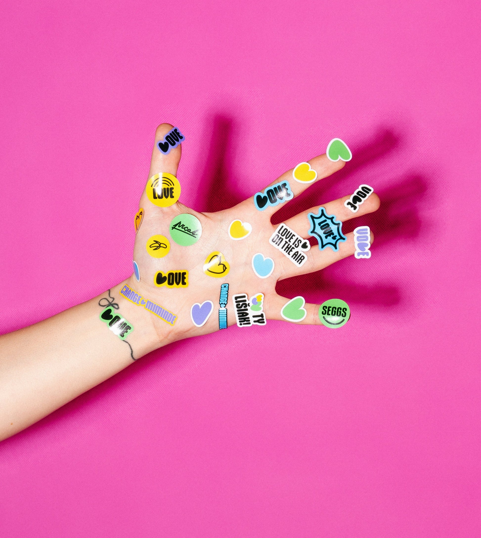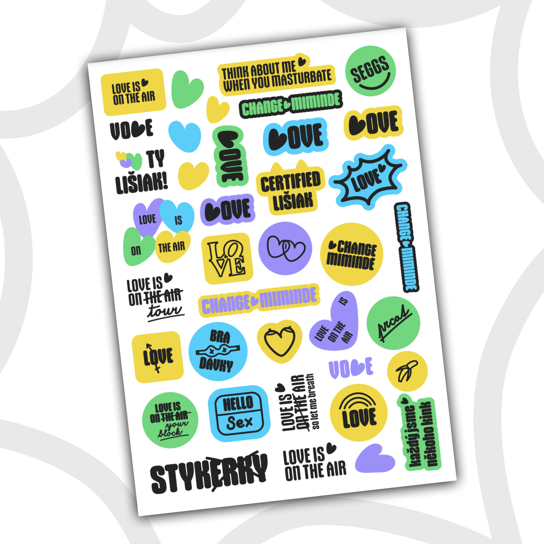 Barevné nálepky plné lásky: seggs, love, prcat, vole, think about me when you masturbate, love is on tour, bra davky, každej jsme někoho kink nebo change miminde. Nalep si lásku na notebook, mobil nebo sešit